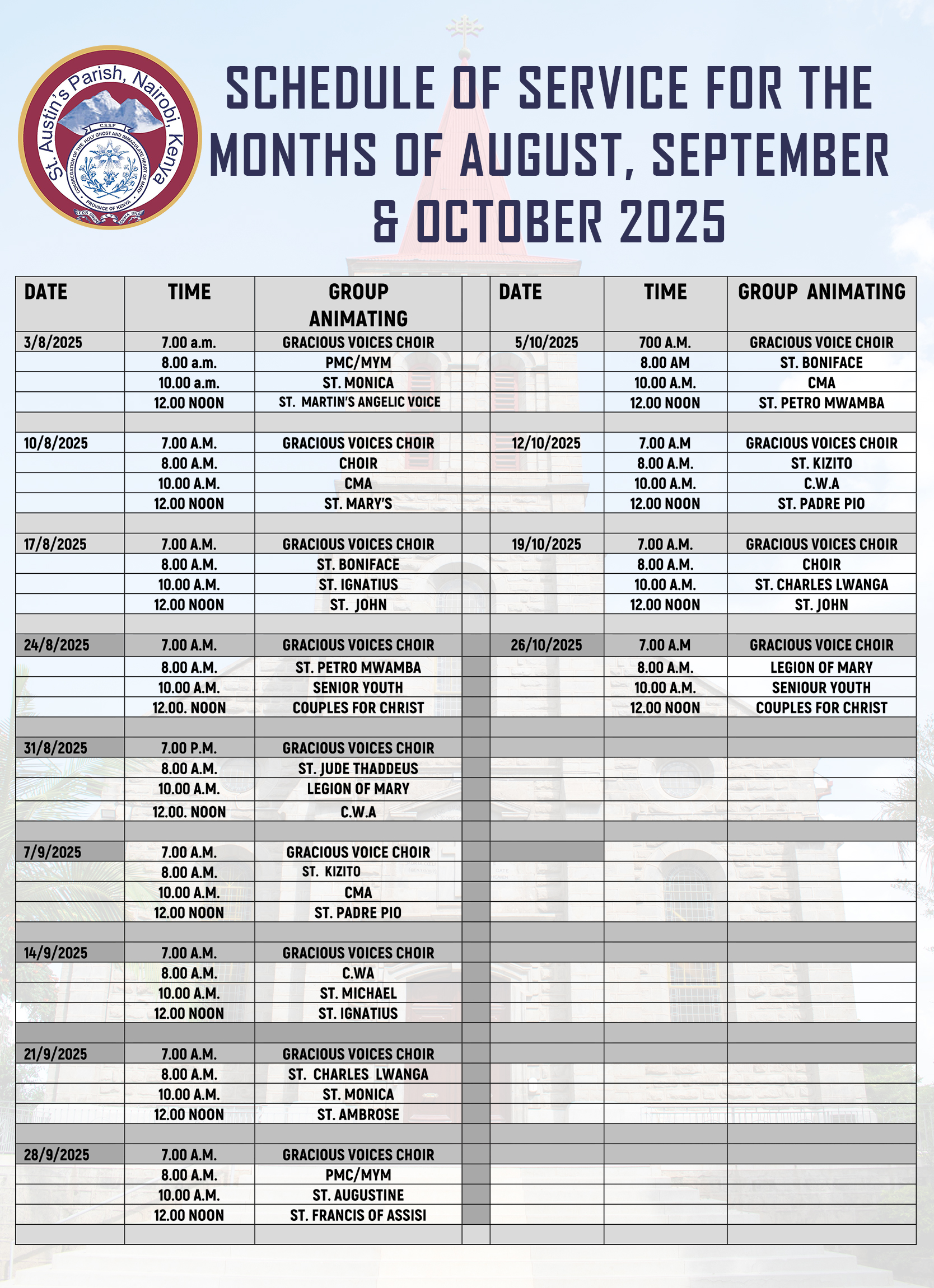 - Jumapili ya leo tarehe 14/9/2025 tunatamatisha wiki yetu ya mavuno. Hundi ziandikwe kwa ST. AUSTIN’S PARISH. Paybill No. yetu ni 593500