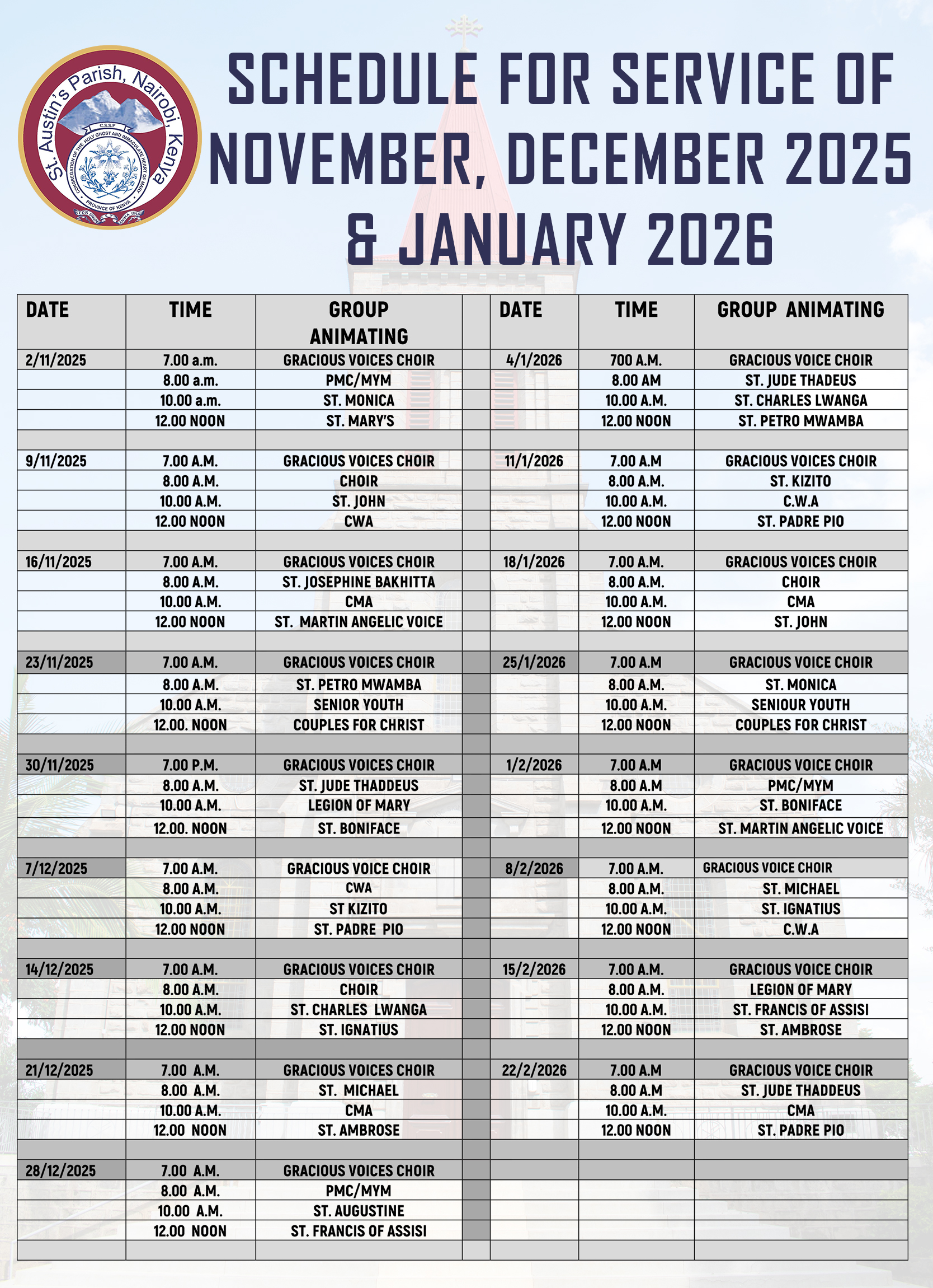 3. The Parish is organizing a teenagers Mass every Sunday at 10.00 a.m. for young people aged 14-19 years. We are currently finalizing on the venue. Teenagers are kindly requested to begin preparing themselves to take part.